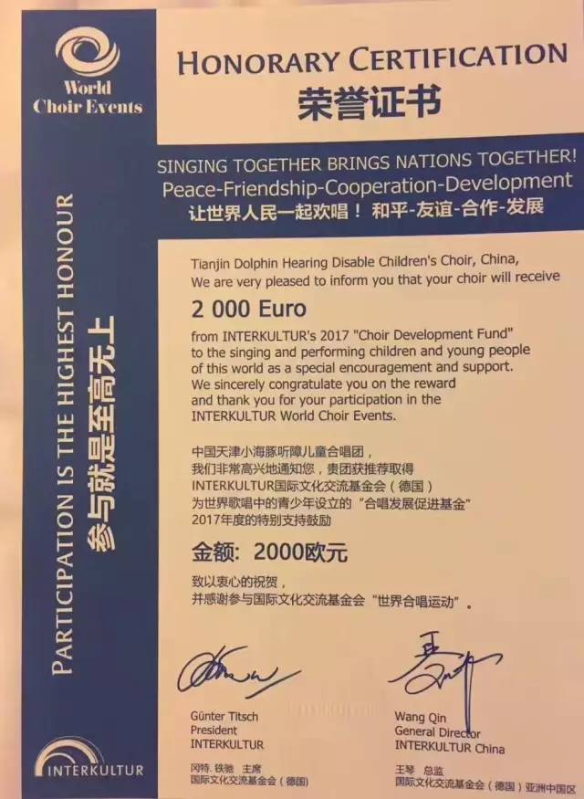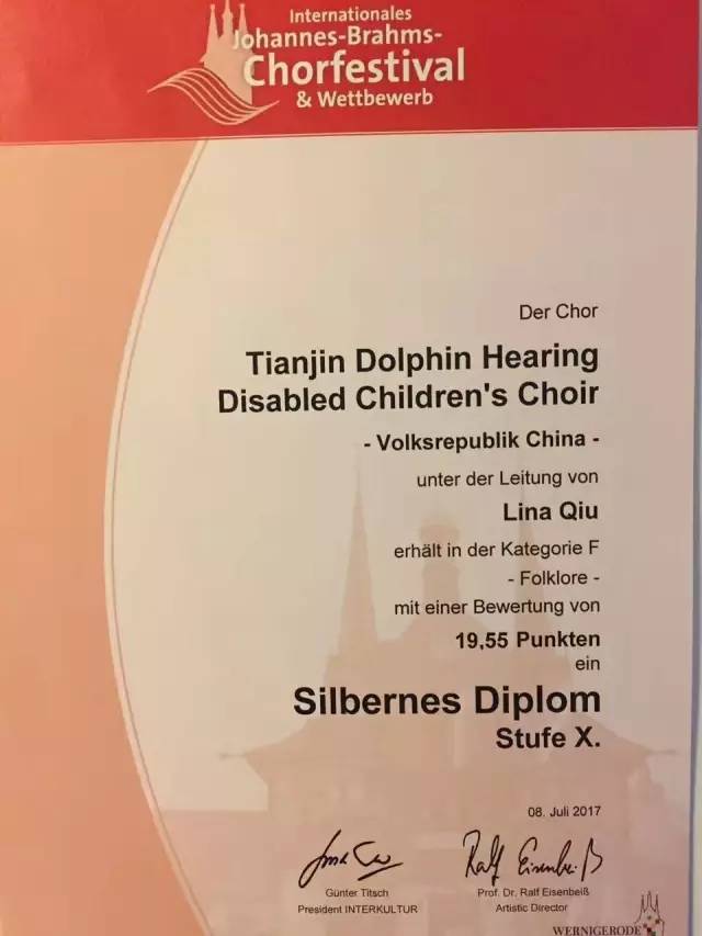 除此银奖还有惊喜:小海豚还获得了国际文化交流基金会(德国)为世界歌唱中的青少年设立的“合唱发展促进基金”2017年度特别奖,