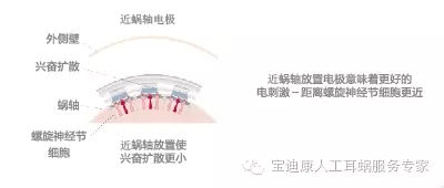 近蜗轴电极刺激接触点位置离螺旋神经节细胞更近,以匹配自然耳蜗形态。插入以后,电极处于放松的静止状态,不会对外侧壁或蜗轴产生压力。研究显示与近外侧壁电极相比,近蜗轴电极可提供更多的集中刺激,因而效率更高,听觉效果更好。
