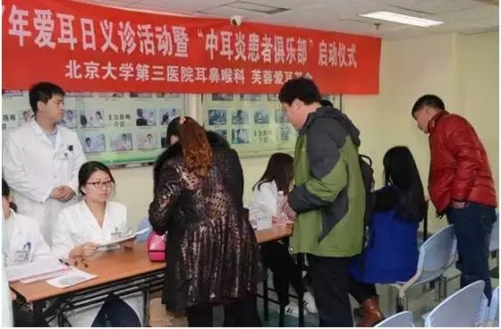 为了迎接我国第18个“爱耳日”,为了响应今年爱耳日的号召,“防聋治聋,精准服务”,向更多的听障人士献出爱心并提供个性化服务,北京大学第三医院耳鼻喉科及北京屈正爱心基金会"芙蓉爱耳基金"于2017年2月26日下午在北京大学第三医院举办了爱耳日大型义诊活动并成立了"北医三院中耳炎患者俱乐部"。来自全国各地的100多位中耳炎患者,包括在我院行中耳炎鼓室成形手术的患者在内,共约200人参加了活动。北京屈正爱心基金会“芙蓉爱耳基金”监事王屹女士出席了活动,北医三院耳鼻喉科老主任李学佩教授、马芙蓉教授、王丽教授、闫燕教授、潘滔教授等十余位专家和全科医务人员出席了活动并为患者进行义诊。