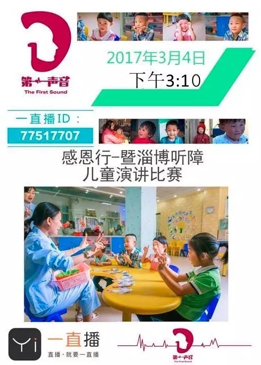 “第一声音”由中国妇女发展基金会和深德公益联合发起,致力于为来自贫困家庭的重度听力损失儿童提供高品质医疗救助,让他们平等地拥有倾听、说话的权利。今天下午由第一声音发起,澳大利亚科利耳公司鼎力支持的“感恩行——暨淄博听障儿童演讲比赛”将在一直播平台为您现场直播,让我们不见不散,共同见证听见的力量!共同温习爱的温暖!