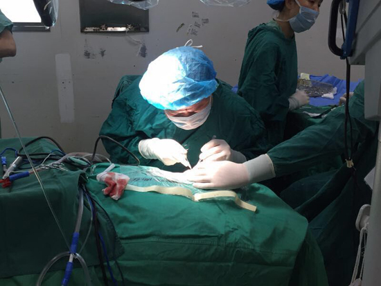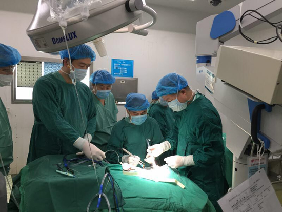 为确保手术成功,郴州市第一人民医院特邀国际著名耳科专家、国内行耳蜗植入术例数最多、北京协和医院曹克利教授亲临指导。在曹克利教授指导下郴州市第一人民医院耳鼻喉科主任唐金勇采用小切口,在显微镜下仔细地磨开乳突,精细地打开面神经隐窝,并注意保护好面神经,充分暴露圆窗龛,于圆窗龛前下方打开鼓阶,并精心细致地将人工耳蜗电极植入耳蜗内,手术很成功,术中监测,人工耳蜗电极反应良好,手术后没有面瘫等并发症。