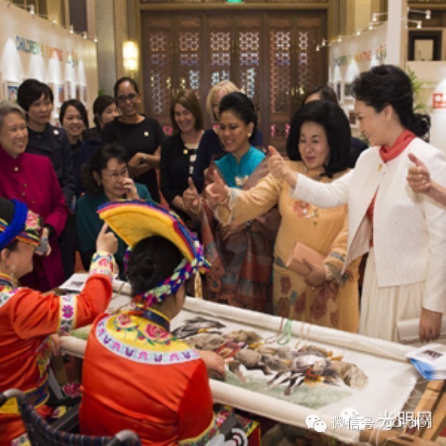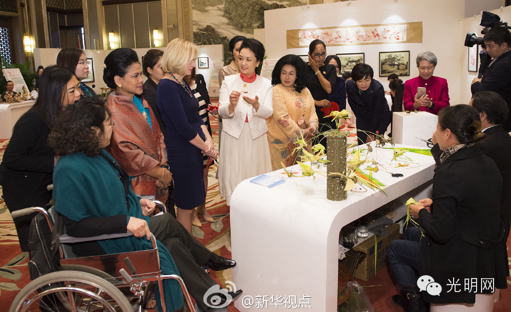 草编展台,盲人编织师编出一个个小巧的花鸟鱼虫,令夫人们爱不释手。彭丽媛请夫人们挑选各自喜欢的作品,送给她们做礼物,自己也挑了一只小小的翠绿色蝈蝈,要“送给女儿做个纪念”。一直到参观结束,那些小礼物还被夫人们捧在手里。(图/文:丁林/郝亚琳)