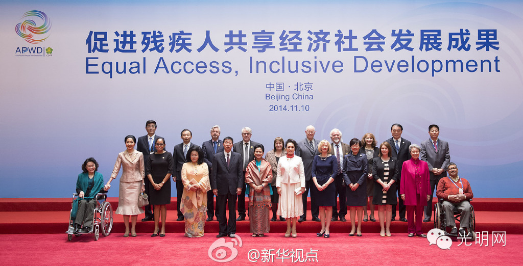 彭丽媛与来宾们出席“促进残疾人共享经济社会发展成果”主题会议并致辞后,观看了中国残疾人艺术团的表演。聋哑人舞者表演的舞蹈《千手观音》、《化蝶》和《雀之灵》,盲人乐队演奏的《风情组曲》等节目博得来宾们阵阵掌声。演出后,彭丽媛与来宾们同演员们一一握手致谢并合影。(丁林、郝亚琳)