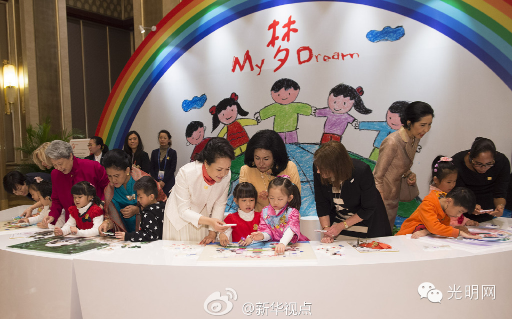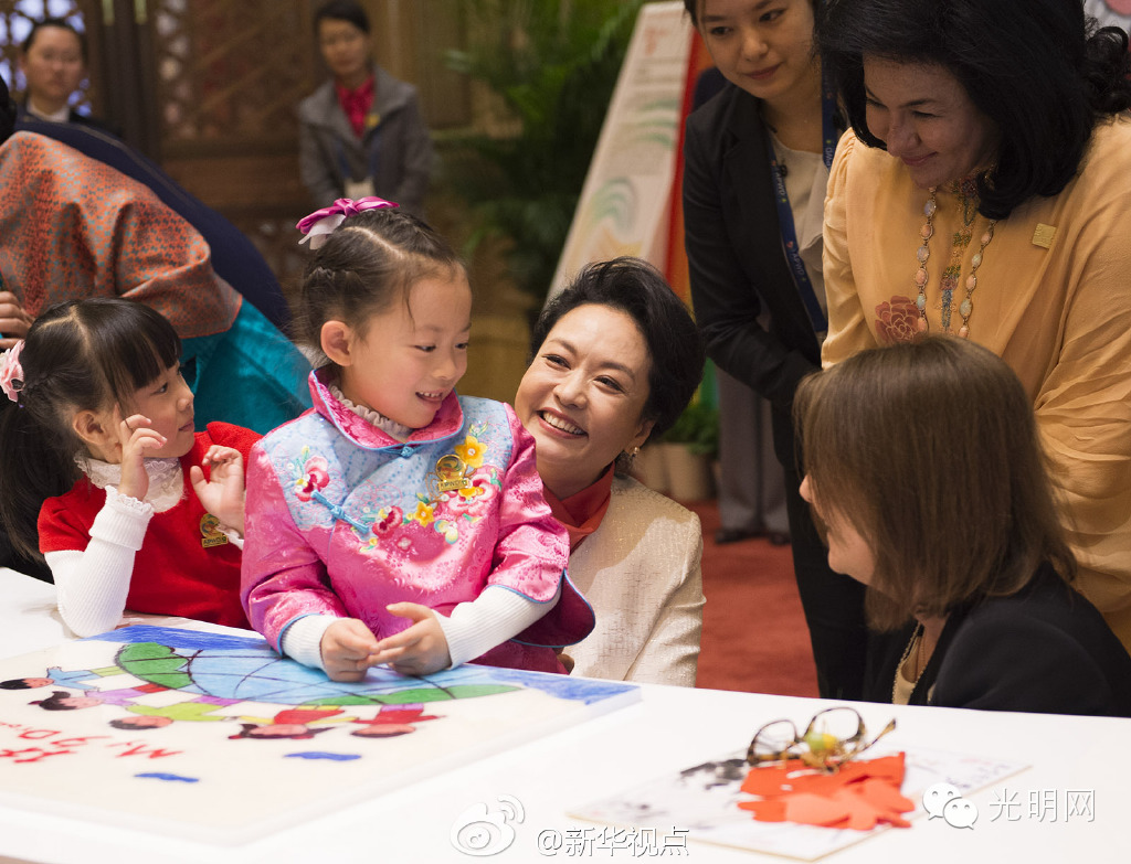 十几名听障儿童正在拼益智拼图,彭丽媛与夫人们俯下身,与孩子们一起完成拼图。一位小姑娘对彭丽媛说:“阿姨,你真漂亮!”还轻轻亲吻了彭丽媛的脸颊。彭丽媛也蹲下身,亲吻孩子的脸颊。孩子们的天真烂漫也感染了在场所有人,现场欢声笑语不断。(图/文:黄敬文/郝亚琳)