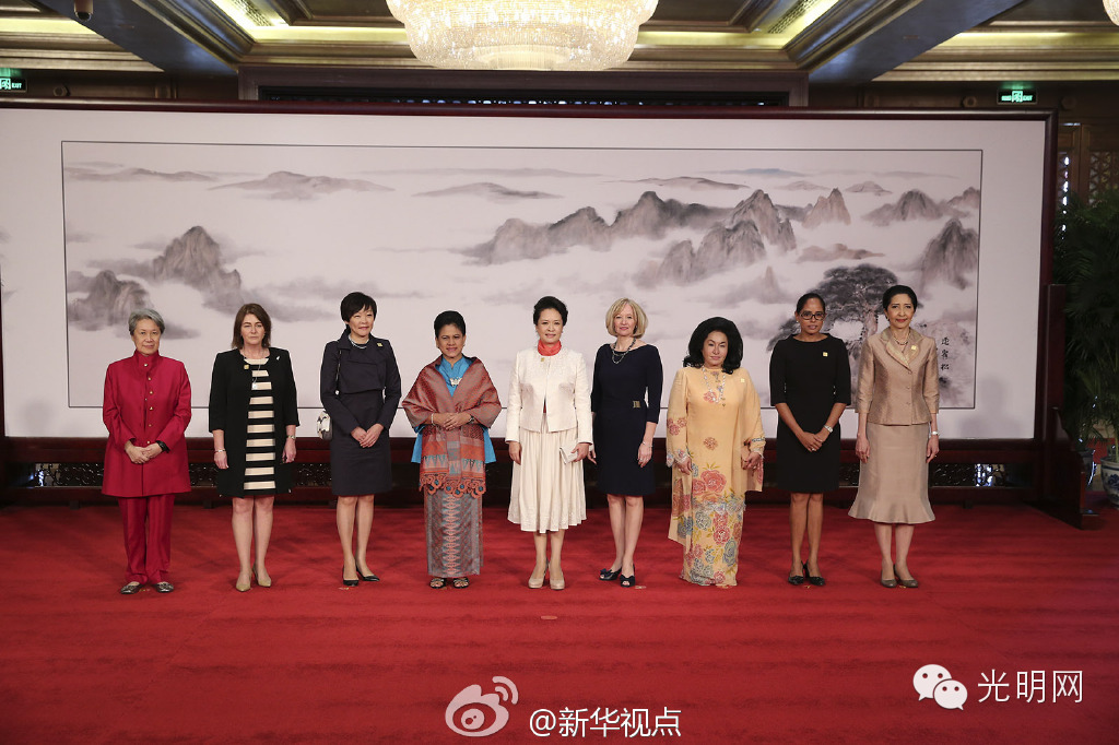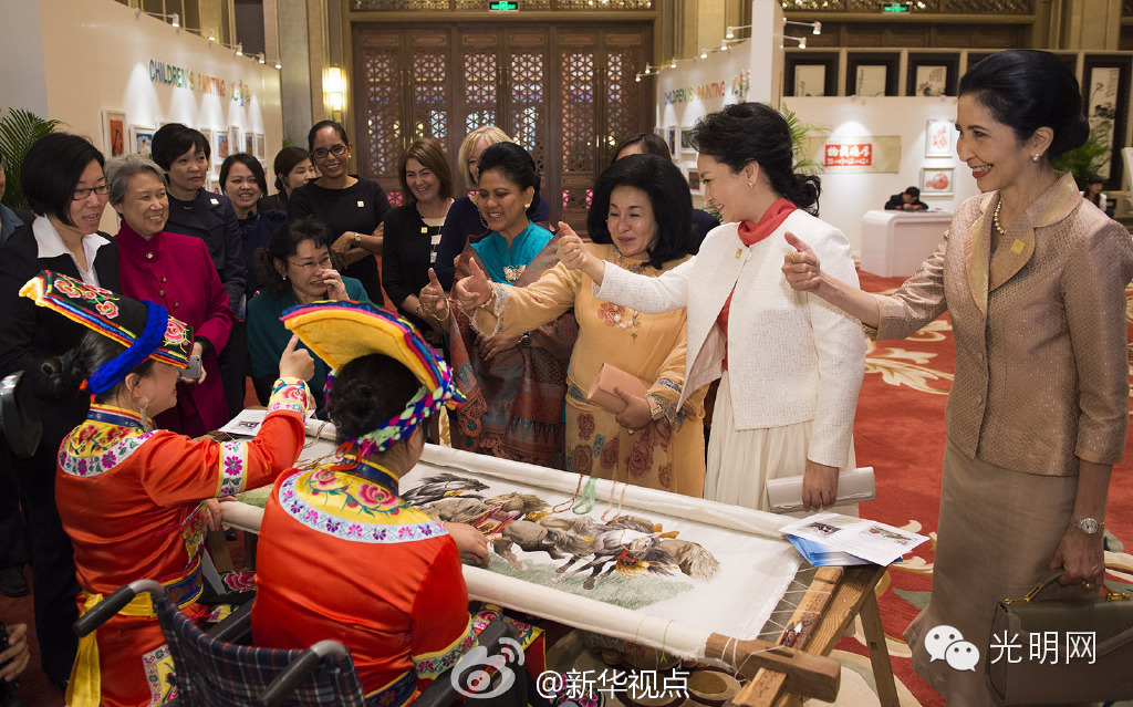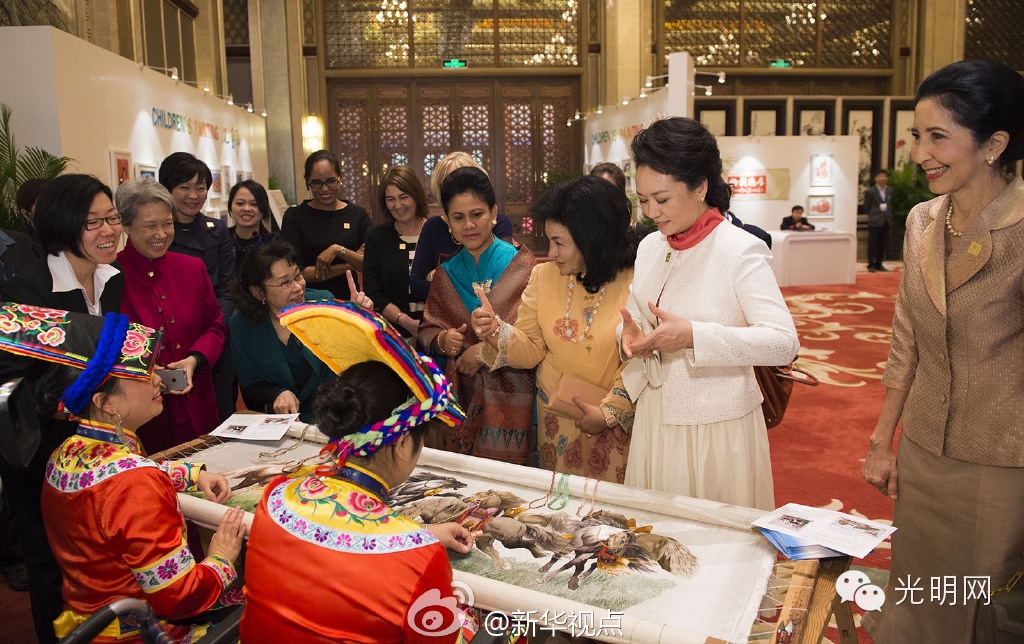 绣架前,来自汶川地震灾区的羌族姑娘宋琴和胡蓉聚精会神地绣着一幅《八骏图》,骏马栩栩如生,引得来宾们赞叹不已,几位夫人还触摸绣图的质感。彭丽媛特意用手语和有听力障碍的胡蓉打招呼:“你很棒”、“我喜欢你”、“谢谢”,并向其他夫人们示范如何表达。夫人们纷纷用手语向姑娘们表达称赞。