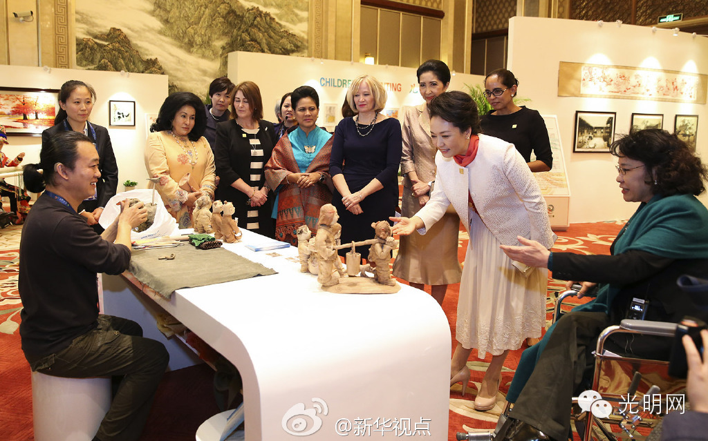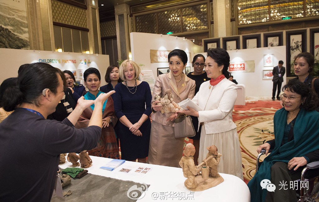 展厅里,聋哑陶艺师康志敏用陶土捏出一个个鲜活灵动的陶塑。看到泰国总理夫人娜拉蓬很喜欢,彭丽媛拿起一尊作品和她一起细细欣赏。康志敏告诉他们,这个作品名叫《母爱》,希望可以作为礼物送给泰国总理夫人。娜拉蓬高兴地收下了这份珍贵的礼物。(图/文:黄敬文/郝亚琳)