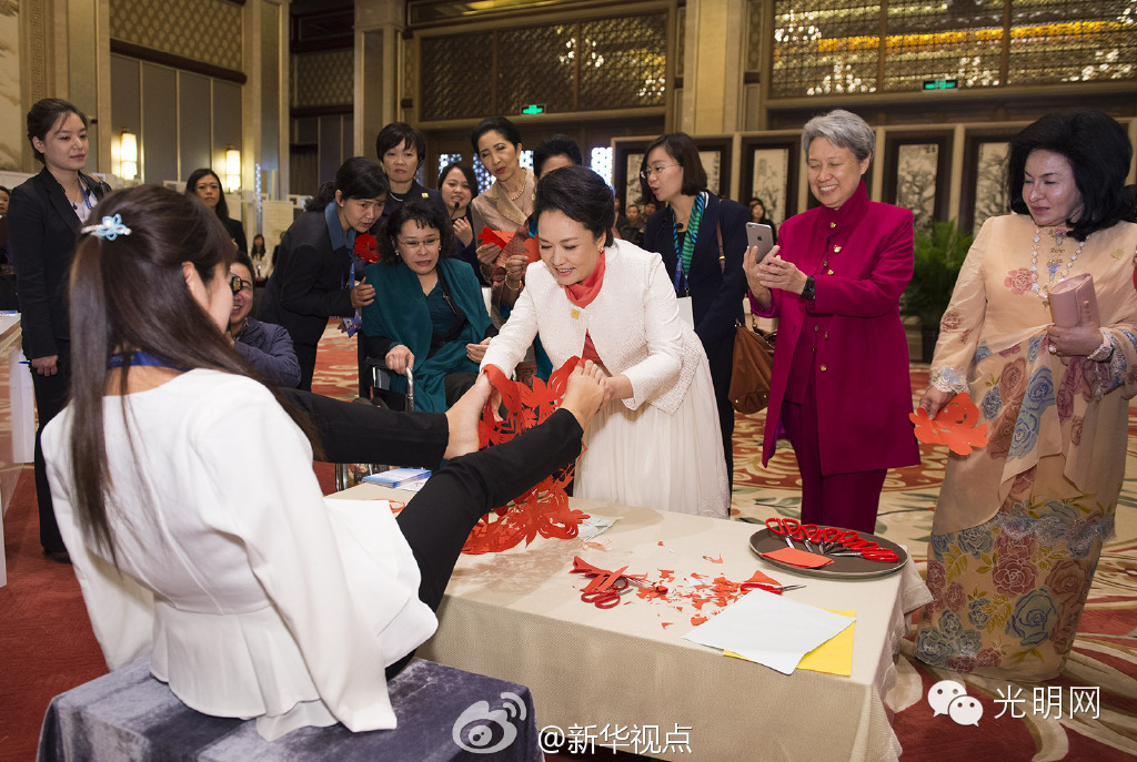 失去双臂的夏红用双脚灵活地剪出一张张大红福字,夫人们对她的“心灵足巧”佩服不已。彭丽媛接过夏红用脚递来的剪纸和平鸽,展示给夫人们看。得知夏红成立了公益团队,帮助其他残疾人学习剪纸技艺、解决生计,彭丽媛特意上前拥抱她,鼓励她将团队做得更好,并表示相信会有更多人关注她的团队。