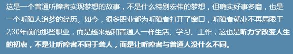 对于听障者来说,就业确实存在诸多限制,虽然我们在听障群体内一直呼吁打开这种不公平的限制,但现实社会是严谨而残酷的,由于社会对听障人士的不了解,有很多听障人士本能胜任的工作也不让听障人士做。即便是实现一个很小的梦想也困难重重,这是一个小人物的故事,他的背后,还有千千万万人在追逐幸福的路上。